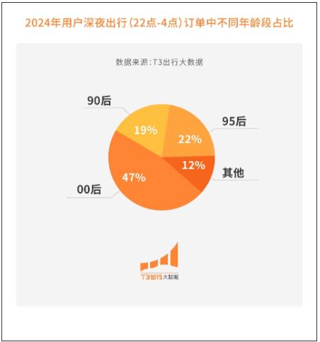 相较于热衷点赞和省钱过日子的八零九零后,00后则扛起了夜经济和文旅出行的大旗。据报告数据,在用户2024年深夜出行(22点-4点)的订单中,90后、95后、00后占比分别为19%、22%和47%,其中00后就接近了半壁江山。