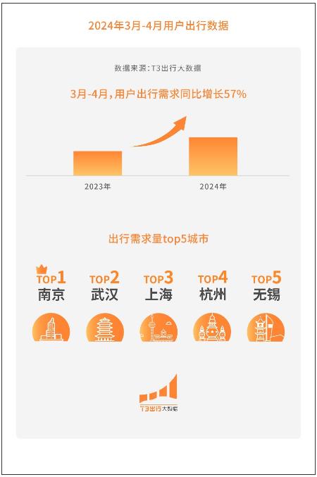 这些也在T3出行的年度报告中得到印证。数据显示,2024年3月至4月,T3出行用户打车需求同比增长57%。其中,南京、武汉、上海、杭州、无锡是出行需求量排名top5城市,南京鸡鸣寺、武汉大学、上海顾村公园、杭州太子湾、无锡鼋头渚等赏花胜地成为出行首选。