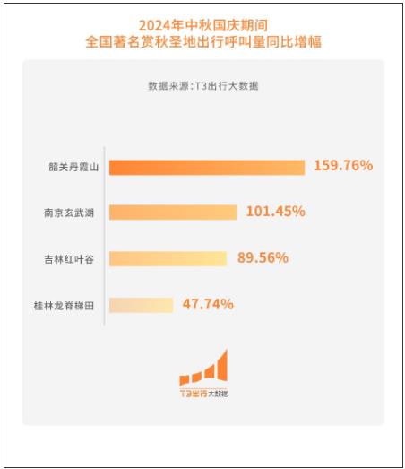 入秋后,韶关的丹霞秋韵、南京玄武湖的金桂飘香、吉林红叶谷的层林尽染、桂林龙脊梯田的金色巨龙等著名赏秋景点则在中秋国庆期间迎来大幅增长,出行呼叫量同比增长分别为159.76%、101.45%、89.56%、47.74%。