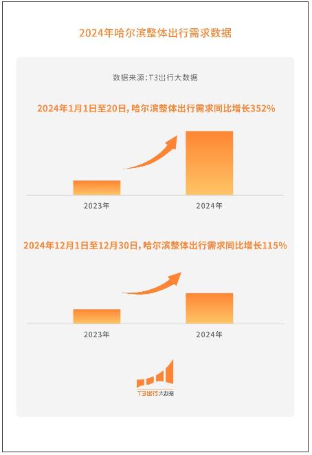 通观全年,哈尔滨无疑是一匹文旅黑马,在冰雪经济的带动下火得又快又持久。报告显示,2024年1月1日至20日,哈尔滨整体出行需求同比增长352%;2024年12月1日至12月30日,哈尔滨整体出行需求同比增长115%。其中,冰雪大世界、中央大街等地点增速更加明显。