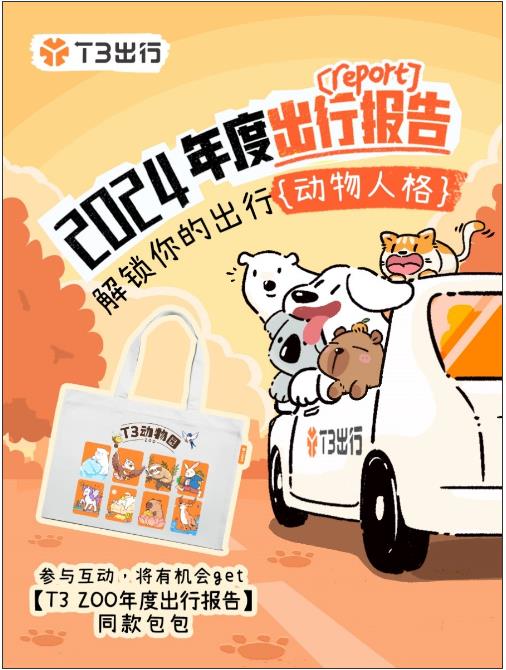 另外,平台还贴心准备了2024年度账单“T3ZOO”定制帆布包,用户可以在T3出行官方微博、微信、小红书等渠道参与互动领取。