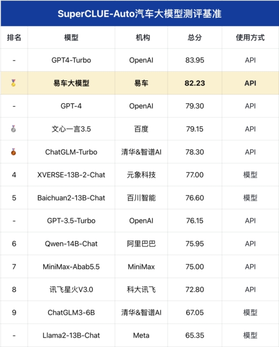 注:数据来源:SuperCLUE,易车大模型数据为2024年6月12日测评结果,