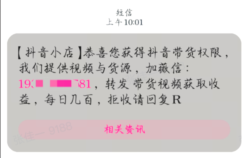 抖音客服工作人员介绍,除了快递,近期诈骗分子还常以“用户被限定高消费”“充电服务已签约扣费”“开通带货权限可获得不菲收入”等多种理由向用户发送短信,一旦用户相信并拨打短信中留下的咨询电话,诈骗分子则完全撇开短信内容,自称“抖音客服”进行诈骗。