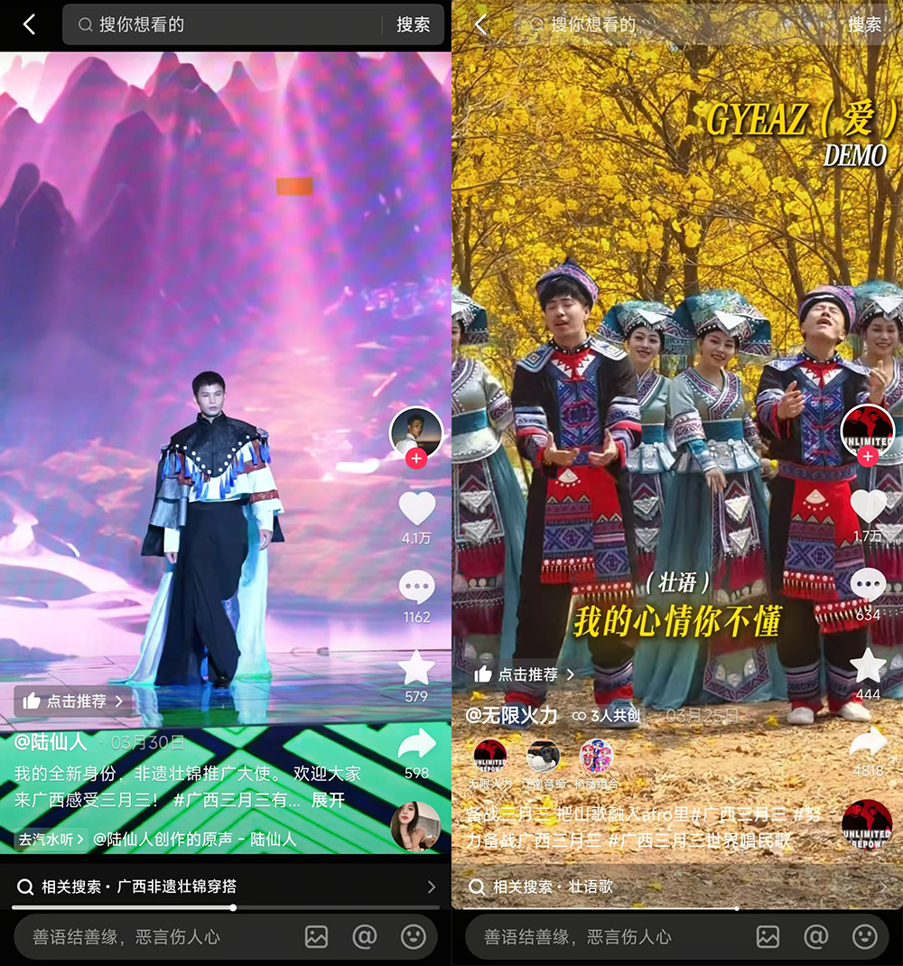 活动中,抖音音乐人@无限火力 组合发布说唱视频《得不得》,在歌词中传达广西三月三快乐长假。在另一部视频中,他们身着壮族传统服饰,将说唱与壮族山歌相结合,吸引了超过1.7万点赞,还获得了@共青团中央 和@人民日报 的转发。在诸多达人和网友的共同参与下,活动线上整体曝光量达3.4亿次。