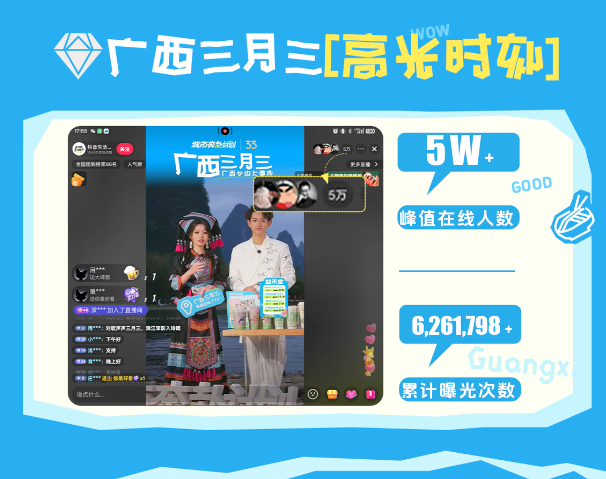 “三月三”是壮族传统佳节,今年三月初三又临近清明节,双节期间,抖音生活服务“城市奔赴计划”落地广西壮族自治区,助力广西商务厅举办“33消费节”,通过政商联动、明星达人营销、三月三特色团购商品、官号直播等方式,传播广西民俗文化,促进双节消费。