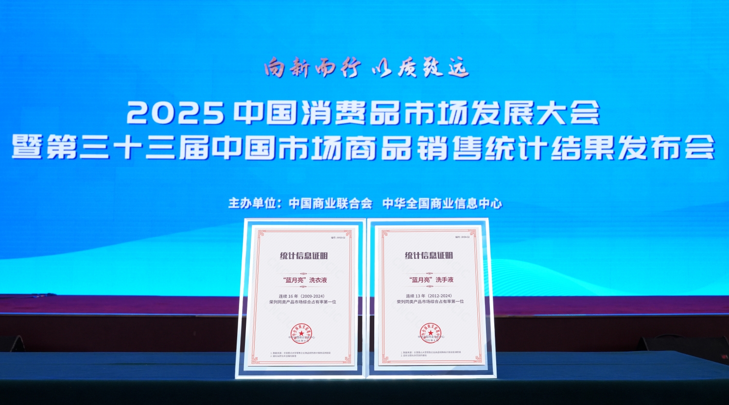 根据会议公布的2024年度中国市场商品销售统计结果,蓝月亮洗衣液、洗手液继续荣列同类产品市场综合占有率第一。这已经是蓝月亮洗衣液连续16年(2009-2024)、洗手液连续13年(2012-2024)获此殊荣。据了解,自中国商业联合会于2009年开始统计洗衣液品类以来,蓝月亮是首个且唯一荣膺洗衣液市占率第一的品牌。