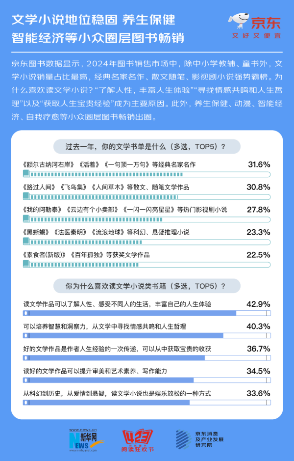 · 文学小说持续受欢迎,经典名家名作、散文随笔、热门影视剧小说强势霸榜。为什么喜欢读文学小说?“了解人性,丰富人生体验”“寻找情感共鸣和人生哲理”以及“获取人生宝贵经验”成为主要原因。