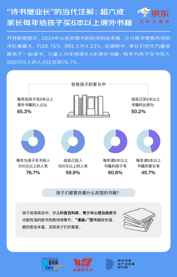 · 家长们也尤为重视跟孩子一起读书,儿童人均年阅读9.4本课外书籍;每年为孩子买书投入500元以上的人占比达到76.7%。