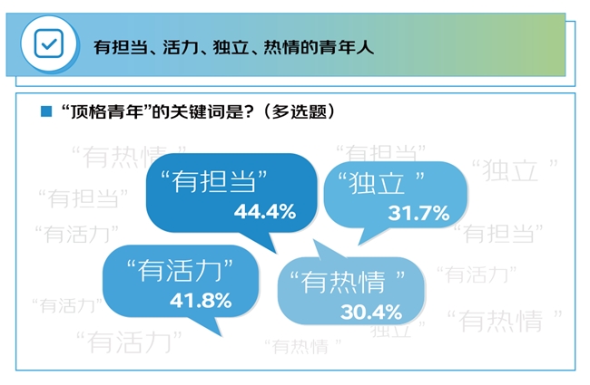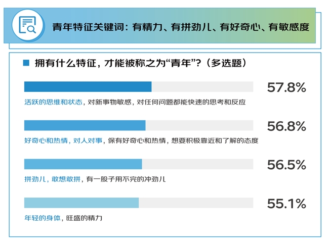 有精力、有拼劲儿、有好奇心、有敏感度成为描述青年特征的主要关键词。主要表现为 “活跃的思维和状态,对新事物敏感,对任何问题都能快速地思考和反应”“对人对事保有好奇心和热情,想要积极靠近和了解的态度”“拼劲儿,敢想敢拼,有一股子用不完的冲劲儿”“年轻的身体、旺盛的精力”。