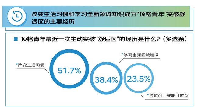 这种理性辩证的成长观,最终会内化为驱动“顶格青年”突破自我的强大力量,让更多人不断提升自我,突破舒适区,获得更好的成长发展。调研显示,改变生活习惯和学习全新领域知识是“顶格青年”突破自我边界的主要方式,用实际行动诠释成长没有边界,他们用持续的自我革新,生动演绎着拒绝停滞、不断突破极限的成长信念。