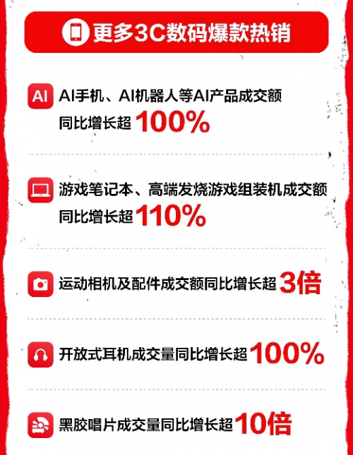 此外,3C数码全品类销售表现亮眼。随着AI相关技术和产品的普惠升级,京东包括AI手机、AI机器人等在内的AI相关商品销售成为黑马,成交额同比增长超100%。除此之外,发烧友惊喜日当天,运动相机及其配件成交额同比增长超3倍,游戏笔记本、高端发烧游戏组装机成交额同比增长超110%,开放式耳机成交量同比增长超100%,涌现出众多明星爆品,带动多个品类销售的强势增长;黑胶唱片成交量同比增长超10倍,显示出在京东拍卖相关商品的带动下,同品类关联销售增长的巨大潜力。