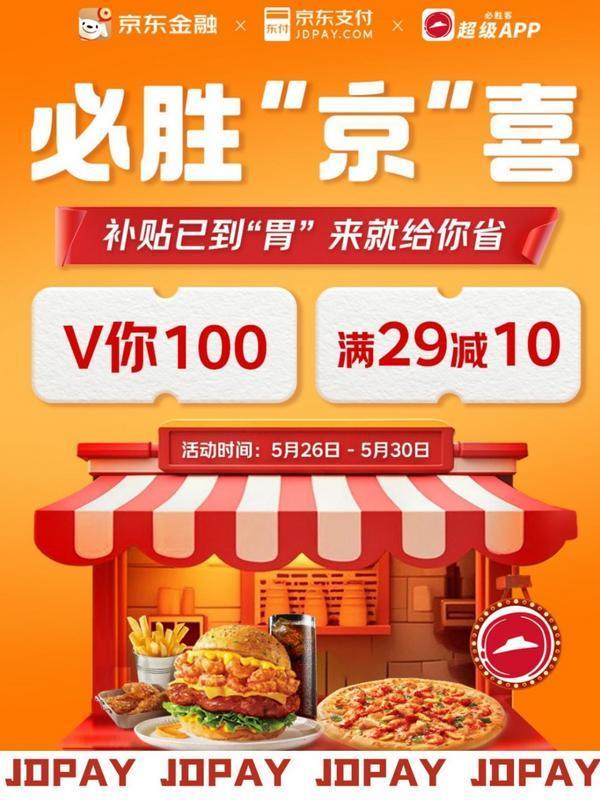 京东支付这次和必胜客联手,不仅让支付更方便,还让吃饭更省。每天1万份优惠,先到先得。赶紧定好闹钟,11点准时开抢。也别忘了去京东/京东金融App搜“必胜客报销”,白吃“霸王餐”的机会就在眼前。