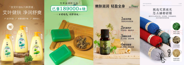 艾草突破“门框驱邪”的单一传统,被广泛应用于艾灸、精油、香薰、泡脚包等多种产品中,艾草从功能到香味被不断挖掘与创新。艾草养生泡脚包配枸杞、 艾草驱蚊空调贴、艾草湿厕纸、艾草沐浴液等成为消费者搜索率较高的艾草产品,艾草香囊、艾草精油等产品也成为热门选择,受草香调热度影响,艾草香也成为香调的一种。消费者认为“艾草的香气能给人带来清爽的舒缓感,比较放松治愈”。