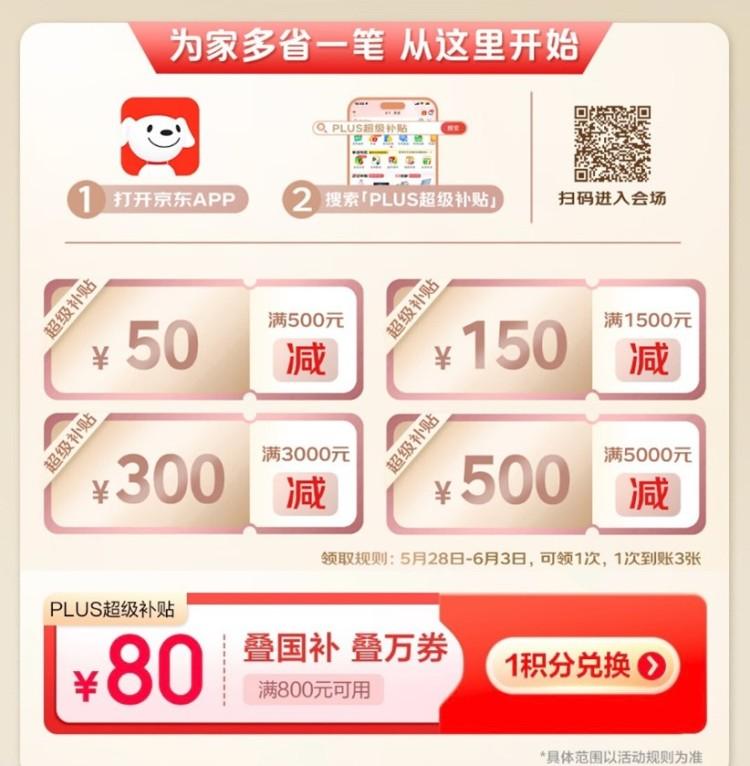 划重点,京东PLUS会员专享的“PLUS超级补贴”大额优惠券来了,无论是家电、3C数码、服饰还是美妆等品类,都能以更低价格买到心仪商品。5月28日0点至6月3日24点,京东PLUS超级补贴券向PLUS会员开放领取,即领即用,包括满5000元减500元、满3000元减300元、满1500元减150元、满500元减50元等不同额度、总面值1000元的优惠券,每位PLUS用户在领券期间可领1次优惠券,每个额度优惠券到账3张,总优惠金额达3000元。值得关注的是,5月30日晚8点将全新上线满800减80全品类惊喜券,每日10点可用积分限量抢购兑换,还能叠加国家补贴、平台其他优惠券使用,让PLUS会员体验超值购物特权。
