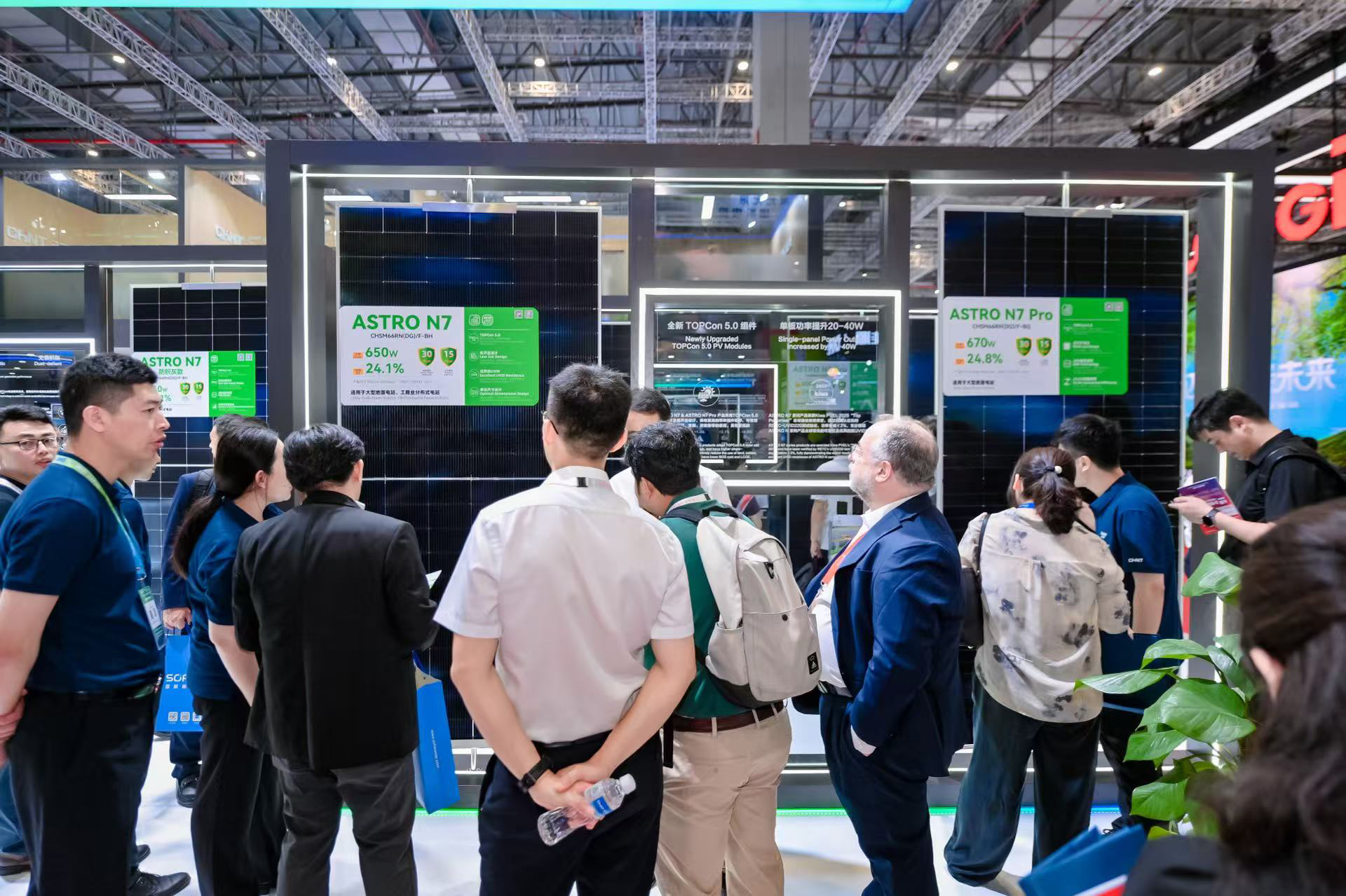 工作人员介绍,ASTRO N7是公司多场景应用的标杆产品,凭借210R矩形硅片与TOPCon 5.0电池技术的融合,最高效率达24.1%。尺寸设计、低开压设计等多维度创新,有效降低了产品运输成本,同时提升组串功率,最终降低BOS成本及LCOE。
