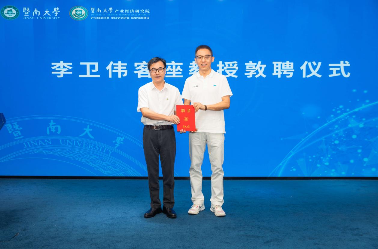 此次受聘暨南大学产业经济研究院客座教授,也是高校对其在产业界影响力与专业能力的高度认可,也为学校与企业搭建了重要沟通桥梁。仪式现场,暨南大学党委常委、副校长顾乃华为李卫伟颁发了聘书。