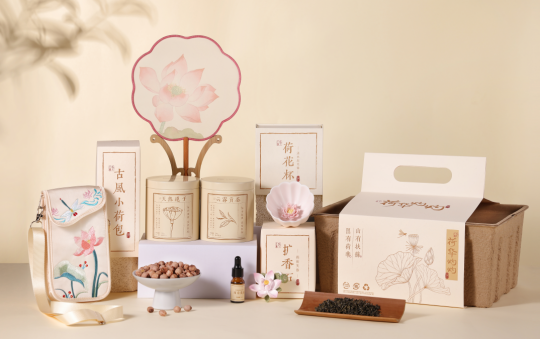在调研过程中,他们发现当地有很多荷花田,每到夏季会吸引不少游客前来观赏。经过前期沟通,三七互娱团队决定以“荷花”为主题设计制作一个文创礼盒。礼盒中有以荷花为创意点的香薰、有荷花造型的茗杯,也有滞销的莲子。