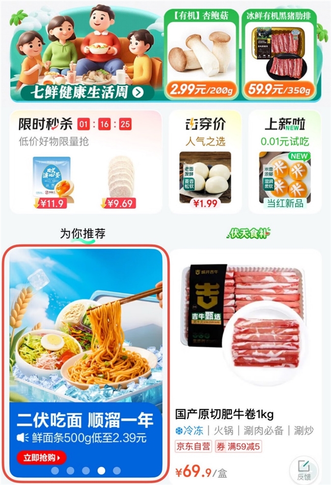 伴随暴雨而来的还有今年的“中伏”,为满足“头伏饺子二伏面”的食俗需求,京东七鲜也同步加大相关商品的备货量,并设立了“二伏面食”专区,方便消费者一站式选购。从筋道十足的鲜细面、鲜宽面、鲜手擀面,到健康取向的黑荞麦面、鸡蛋面等,专区“面面俱到”。更有《舌尖上的中国》推荐的非遗手工技艺传承人张爷爷同款手工空心挂面——七鲜鲜奶手工空心挂面与七鲜鲜奶手工空心龙须面近期上线,每袋添加40ml鲜奶,非遗手工制作,配料干净,价格更低至9.9元。如果想在家复刻一碗经典的老北京炸酱面,专区也为消费者精心搭配好了食材,只需动动手指,精选去皮五花肉、地道豆瓣酱与甜面酱、清脆的黄瓜与胡萝卜、新鲜的大葱等核心食材便能一键加入购物车,让一碗浓郁地道的北方夏日风味轻松呈现。