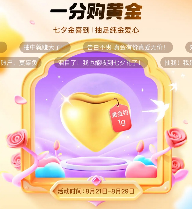 今年七夕,京东珠宝钟表超级品类日还重磅推出“1分购黄金”活动,奖品池内含2.3克足金999小熊花束转运珠、1克足金999爱心转运珠等,即日起至8月29日,在活动页面开通京东黄金账户即可获得抽签机会,有机会1分钱带走精美黄金饰品。