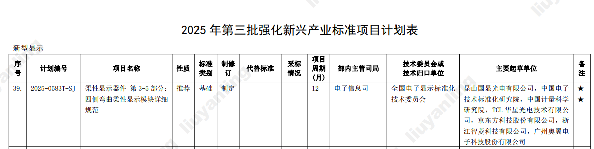 近日,工业和信息化部下发《工业和信息化部办公厅关于印发2025年第三批行业标准制修订和外文版项目计划的通知》,由维信诺主导的行业标准《柔性显示器件 第 3-5 部分:四侧弯曲柔性显示模块详细规范》获批立项。