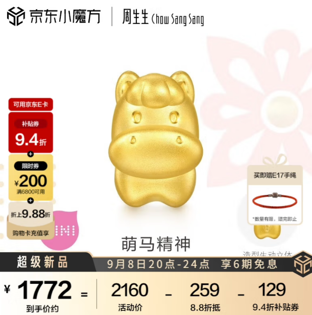 2026年为中国农历马年,此次在京东首发的十二生肖马年黄金转运珠,以小马形象为核心元素,造型圆润立体,适合日常佩戴与节日纪念等多种场景。9月8日晚8点起,前4小时下单的消费者可享低至8.8折优惠及6期免息。