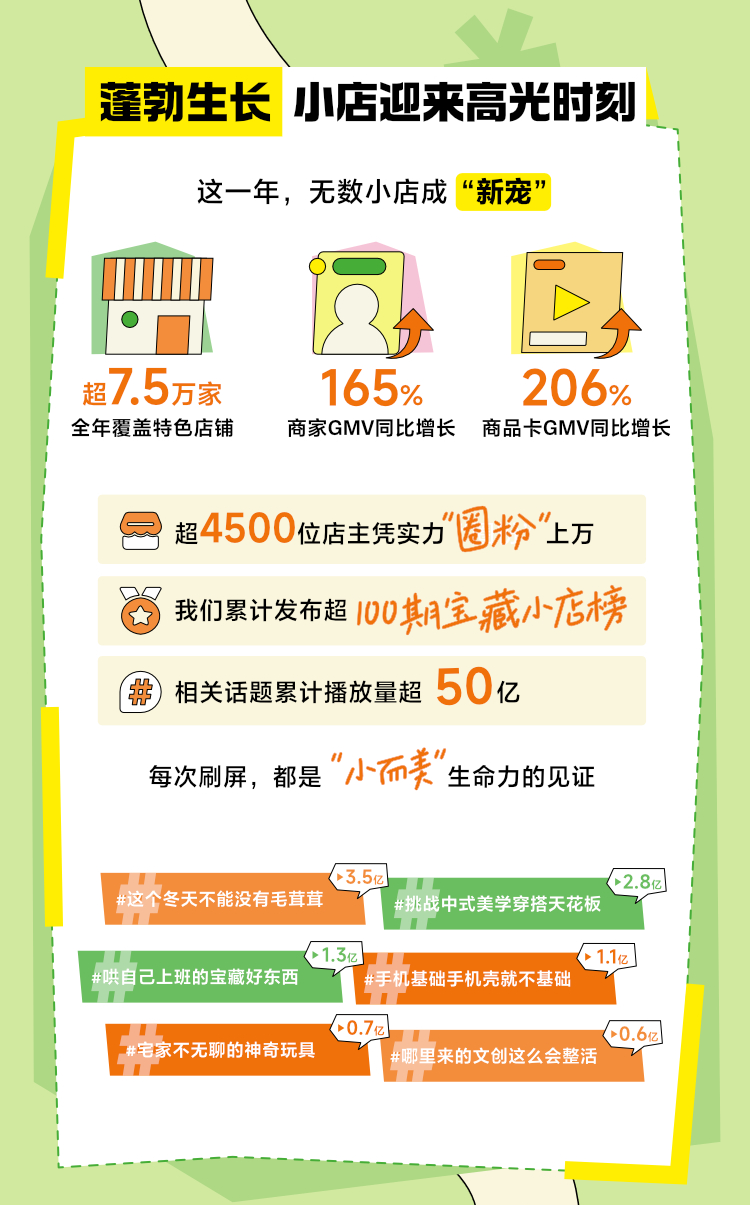 2025年抖音电商累计发布超过100期宝藏小店榜单,相关话题累计播放量超50亿。内容升级叠加流量扶持,让特色小店的生意有了明显增长。《报告》显示,7.5万家特色店铺的GMV同比增长了165%,其中商品卡GMV同比增长206%,超过4500位店主的粉丝量破万。