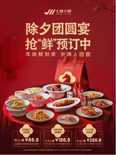 2月1日,京东旗下品质餐饮品牌七鲜小厨宣布首次上线年夜饭套餐,提供涵盖2至6人规模用餐需求的三种不同规格套餐,用“现炒+透明厨房”的模式增添年味。同步还推出“下单赠礼”主题活动,2月2日至2月14日,用户在京东App预订七鲜小厨年夜饭,2月16日除夕当天即可收到新鲜现炒的丰盛年夜饭大餐,预订套餐均可获赠好酒,最高可获赠价值168元的美酒大礼。