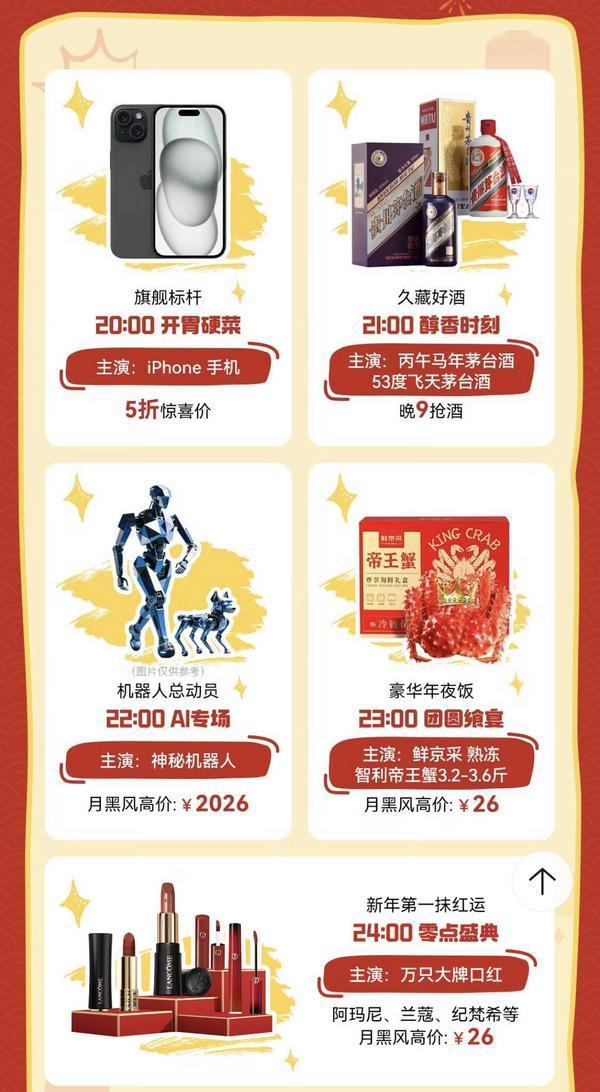 其中,2月16日晚8点,iPhone手机将以不止5折的惊喜价格上架,想换新机又追求性价比的用户绝对不容错过。不仅有大牌手机,当晚9点,多款美酒佳酿也将集体上线,包括飞天茅台、马年茅台等稀缺酒品,等你入手。作为今年大热的赛博年礼,机器人、机器狗也成为不少人为亲友选择的生活陪伴。除夕晚10点,京东“月黑风高”超级盛典将上线多款爆款AI机器人等智能产品。