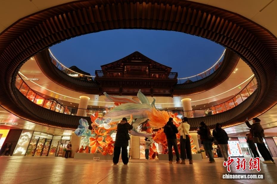 2月9日,民众在北京中海大吉巷的一处春节艺术装置前打卡拍照。春节临近,该商场打造多种春节景观,为市民寻年味提供去处。中新社记者 张祥毅 摄