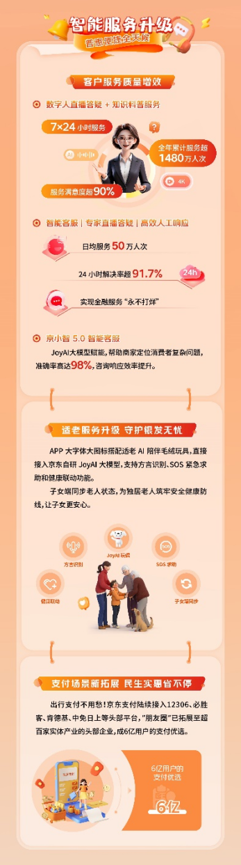 在服务方式上,京东金融深化数字技术应用,推出“数字人直播答疑+知识科普”智能服务模式,日均服务超50万人次,7×24小时在线响应,京小智5.0智能客服准确率达98%,显著提升服务可及性与效率。年报显示,通过智能客服与人工服务的协同,用户咨询解决率与满意度均实现双位数增长,客户服务实现从“有”到“优”的跨越。针对老年群体,京东金融APP推出“大字版”“语音助手”等适老化功能,同步上线“子女代绑”服务,为独居老人筑牢安全健康防线;在隐私保护领域,建立全流程数据安全管理体系,用户信息实行加密存储、授权使用,全年未发生重大信息泄露事件。