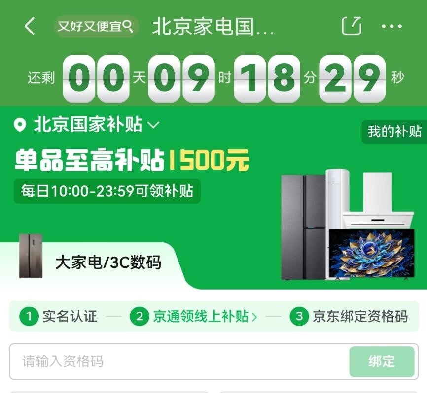 随后打开京东APP或微信京东购物小程序,搜索“北京家电以旧换新”进入北京会场,找到“绑定资格码”入口进行绑定;之后可以在京东的北京活动会场浏览选购,也可直接搜索符合要求的商品选购,新机收货地址需在北京市内,即可享受补贴。用户可选择单独购买产品,也可选择使用以旧换新下单,均可享国补。