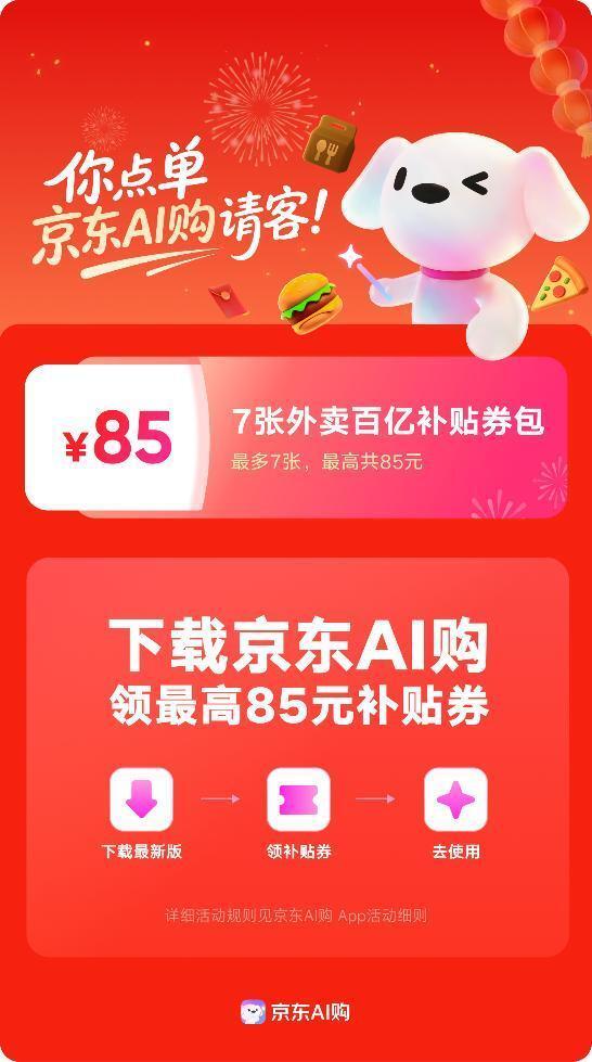 2月14日晚8点起至2月23日的春节期间,使用“京东AI购”下单的APP新老用户,最高可领取 7 张、总价85元的外卖百亿补贴券。用AI的方式分享马年新春大红包!