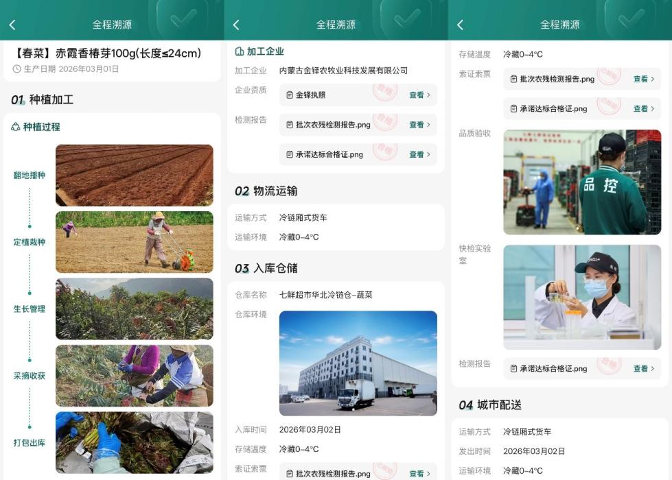在产地直采基础上,京东七鲜通过自研的“食安品质全链路”溯源系统,将春菜的食品安全透明化、可视化。消费者只需点击七鲜APP或小程序商品页的“全程溯源”,就能清晰查看春菜从基地到门店的完整流通过程,包括基地资质、农残检测报告、物流温控数据、入库验收信息等关键内容。以赤霞香椿芽为例,系统可展示蔬菜种植、采摘的实拍照片,加工企业资质与出厂检测报告,物流运输中的温控数据,以及到店时间与存储条件等,各环节信息完整串联,让消费者买得明白、吃得放心。