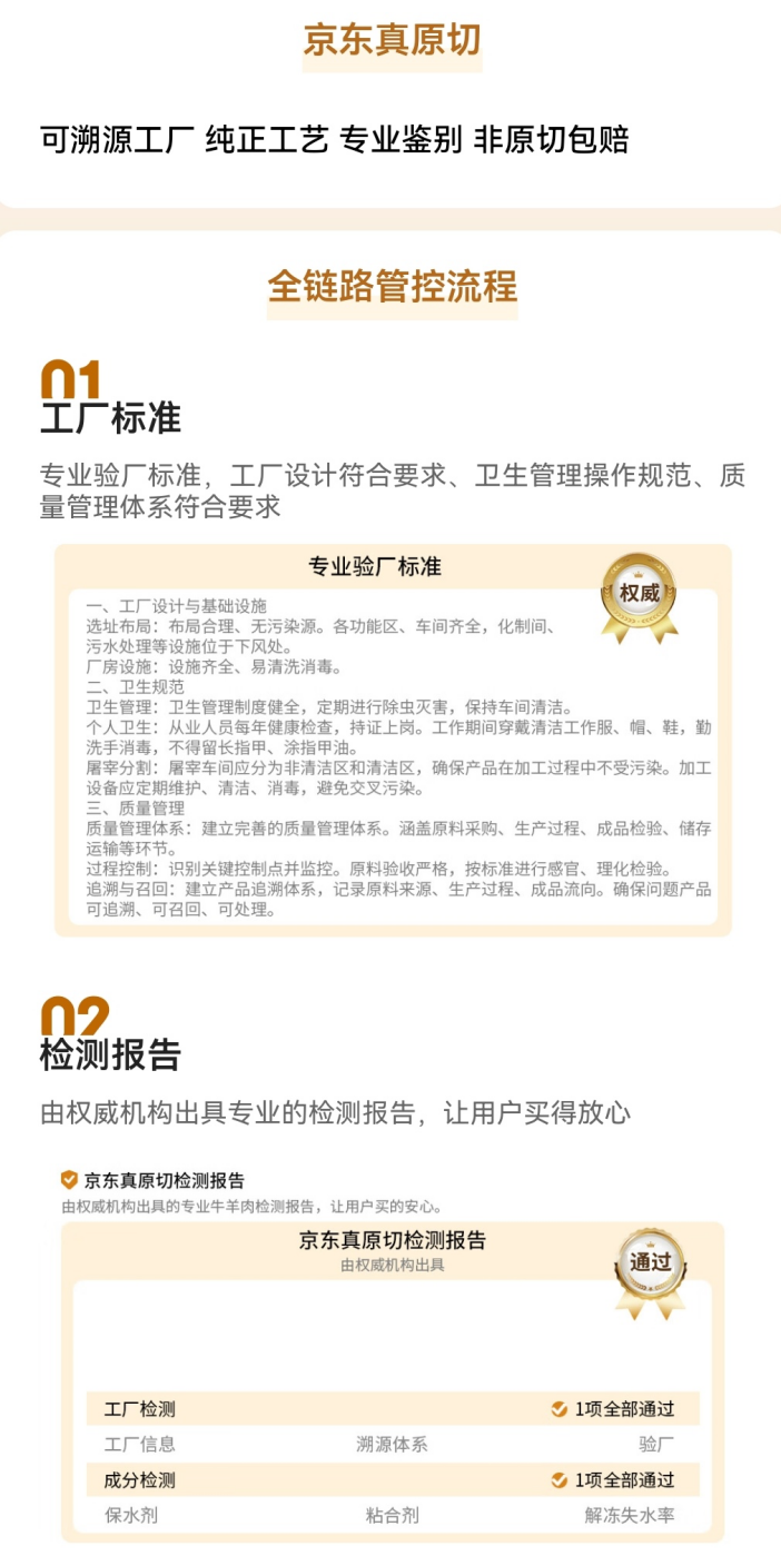 “有一些商品虽然也是原切的,但是工厂没办法提供过往加工工艺视频和检测报告,我们也不会打‘真原切’标,一定要保障产品品质可靠、可溯源。”京东牛肉采销介绍。