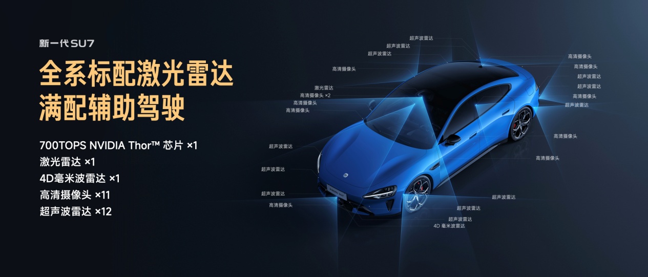 新一代SU7全系标配NVIDIA DRIVE AGX Thor™车载计算平台,算力高达700TOPS,较前代提升37.8%,采用与NVIDIA旗舰芯片同源的Blackwell架构,具备更强的并行计算与深度学习能力,支持更高速数据传输与多样化连接,配合高性能DDR缓存,显著提升系统响应速度与决策效率。在感知硬件方面,全系标配1个激光雷达、1个4D毫米波雷达、11个高清摄像头、12个超声波雷达。