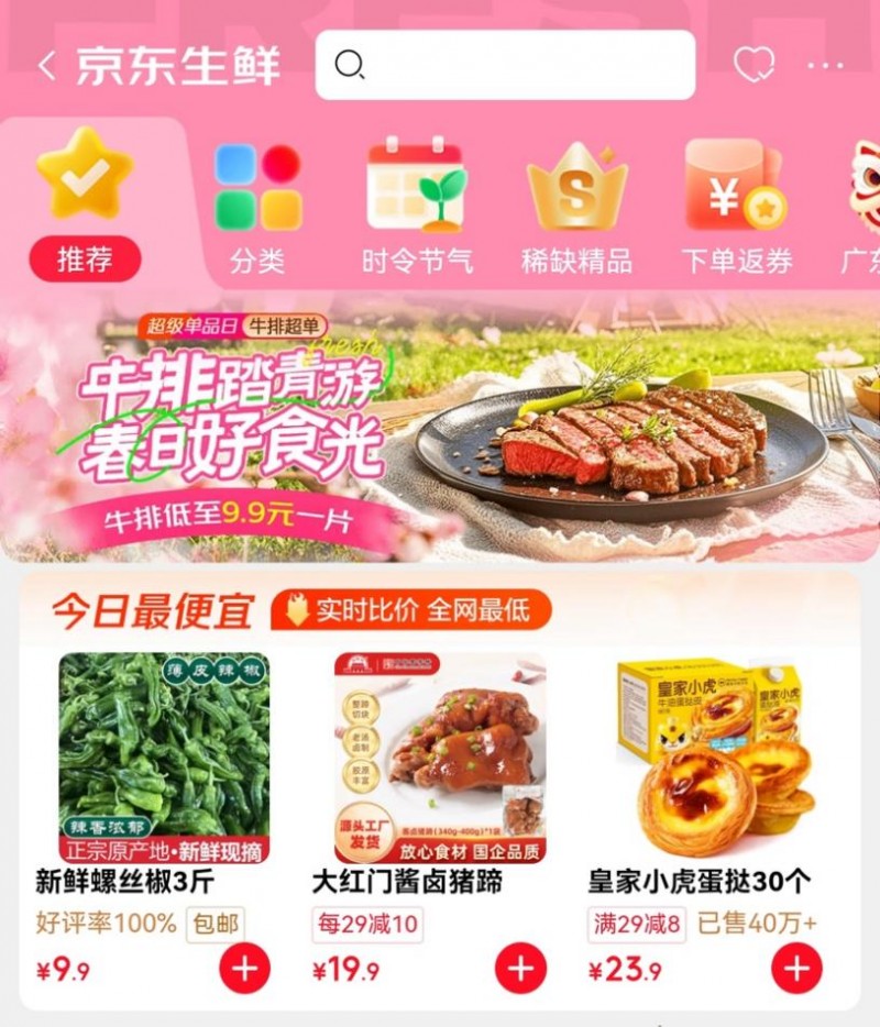 以最新上线的几款新品为例,农根蔬新鲜螺丝椒为农家自种时令蔬菜,皮薄个大、风味浓郁,3斤仅售9.9元,比其他平台优惠20%以上;皇家小虎蛋挞套装,包含30个蛋挞皮和1盒蛋挞液,自带锡纸托,适配空气炸锅,京东仅售23.9元,较其他平台便宜近10元;大红门酱卤猪蹄,酱香入味、开袋即食,售价低至19.9元,也低于其他平台25.77元的最低价,性价比可谓拉满。