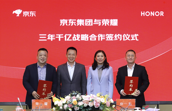 4月2日,京东与荣耀签署战略合作协议,明确未来三年荣耀在京东全渠道实现销售额突破1000亿元的目标。根据协议,双方将基于各自优势,围绕产品共创、用户共营、生态共享三大维度,提升荣耀全品类销售规模,加快荣耀AI终端普及,开启用户全场景智能生活。同时,双方在深化零售、物流、科技、金融领域合作的基础上,也将进一步拓宽政企、工业、健康、保险、国际等领域合作边界,实现多产业深度融合与协同发展,探索更广阔的市场增长空间。