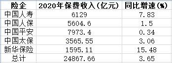 五大险企2020年保费2.49万亿 人保寿险负增长财险持平
