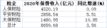 财产险方面,“老三家”人保财险、平安财险和太保财险2020年累计实现保费收入8659.68亿元,同比增幅为3.56%。人保财险依然不改其财产险“一哥”地位,2020年累计实现保费收入4320.19亿元;平安财险和太保财险保费收入分别为2858.54亿元和1480.95亿元。