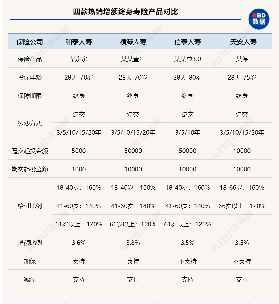 《每日经济新闻》记者搜集了市场上几款热销的增额终身寿险产品注意到,其增额比例的范围在3.5%~3.8%之间。“增额终身寿险的保障会不断增长,给客户的心理暗示比较好。”上海昱淳精算咨询合伙人徐昱琛在受访时认为。