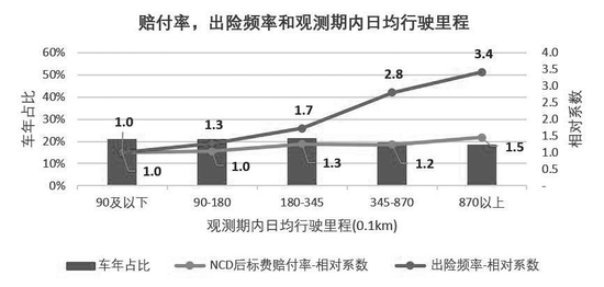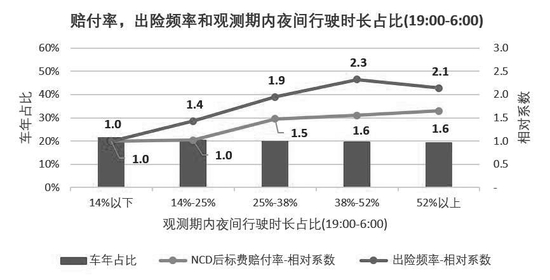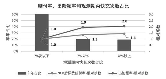 数据分析表明,日均行驶里程越长、夜间行驶时长占比越大、快充次数占比越高的车辆,出险频度和赔付率越高(图13、14、15)。