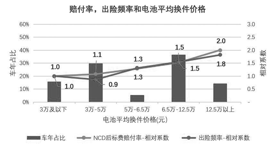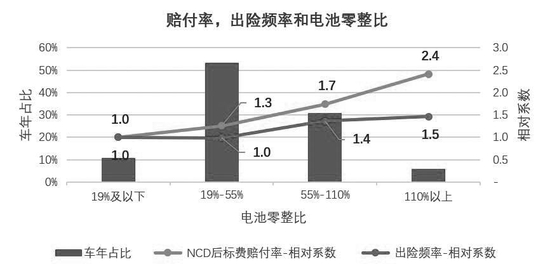 除此之外,电池价格差异对赔付风险也有尤为显著的差异效果。数据显示,从组1到组5,随着电池平均价格上升,风险也随之呈上升趋势(图7)。