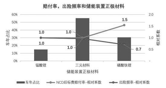 从发展趋势来看,未来纯电动车将主导我国新能源车市场。纯电动车的电池种类繁多且其所用的正负极材料也很多元,例如:多元复合锂、镍钴锰酸锂、三元材料、磷酸铁锂等。经实践数据证明,用多元复合锂和镍钴锰酸锂材料作为装配电池材料的车险赔付低于行业平均(图4)。