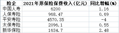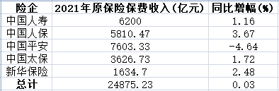 五大险企2021年保费2.49万亿 寿险规模仅人保不足千亿