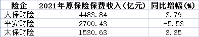 2021年,财产险保费收入增速分化。人保财险、平安财险和太保财险全年实现原保险保费收入分别为4483.84亿元、2700.43亿元和1530.63亿元,同比增幅分别为3.79%、-5.53%和3.35%。