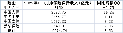 中国经济网北京4月15日讯 (记者 马欣) 截至昨日晚间,A股五大上市保险公司已悉数披露2022年一季度保费收入。中国人寿、中国人保、中国平安、中国太保和新华保险当期合计实现原保险保费收入10074.74亿元,同比增长3.52%。