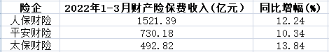 财产险业务上,人保财险、平安财险和太保财险2022年一季度数据亮眼,3家公司保费收入同比均实现两位数增长。