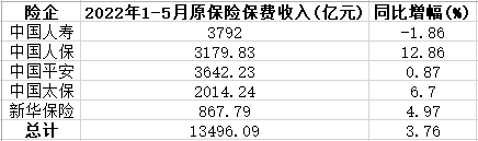 2022年前5个月,中国人寿、中国人保、中国平安、中国太保和新华保险分别实现保费收入3792亿元、3179.83亿元、3642.23亿元、2014.24亿元和867.79亿元,同比增幅分别为-1.86%、12.86%、0.87%、6.70%和4.97%。