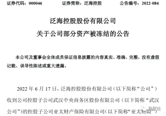 6月20日,泛海控股股份有限公司(以下简称:泛海控股)公告称,其子公司武汉中央商务区股份有限公司(以下简称:武汉中央商务区)所持有的亚太财产保险有限公司(以下简称:亚太财险)51%的股权被司法冻结。