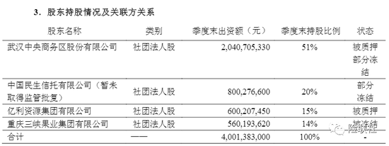 据亚太财险最新偿付能力报告显示,截至今年一季度末,除武汉中央商务区所持51%股权被质押、部分被冻结外,暂未取得监管批复的民生信托所持20%股权也显示被部分冻结;亿利资源集团有限公司所持15%股权被质押;重庆三峡果业集团所持14%股权被冻结。据亚太财险对相关媒体透露,截至今年6月12日,股东质押比例已达66%,股权冻结比例65%。